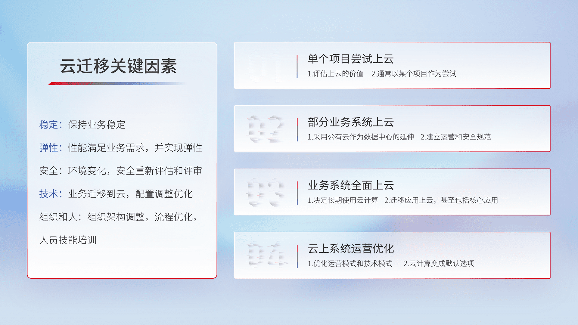 结合实际业务,,从规划设计、、、云平台选型、、云原生改造、、、数据迁移、、集成交付,,,迁移全过程为客户识别最佳上云路径,,,,做好风险识别管理,,设计网络架构、、、身份权限、、安全审计合规、、、操作审计、、日志审计、、、监控告警策略、、、、多站点容灾设计等,,对云上基础设施进行整体规划,,,,提升IT治理水平,,以满足弹性、、、高可用、、高性能的需求。。。